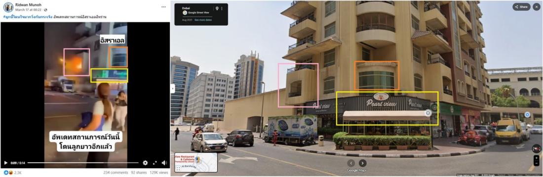The name of the burning restaurant -- "Pearl view" -- is visible in the video and corresponds to Google Street View imagery of the establishment in Dubai's Al Barsha neighbourhood (archived link).