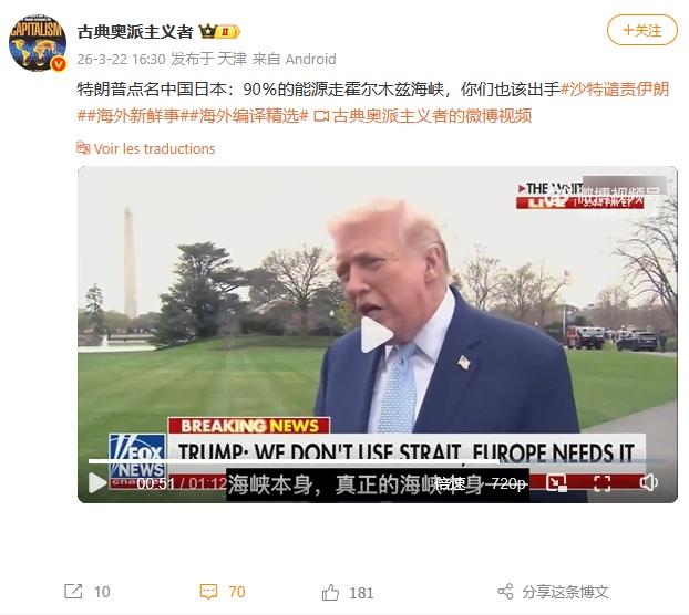 "Trump often uses hyperbole. There is nothing to suggest that the claim of the (People's Republic of China) importing 90 percent of its oil through the Strait of Hormuz is true," Chong Ja Ian, an associate professor of political science at the National University of Singapore (NUS), told AFP via email on March 20 (archived link).