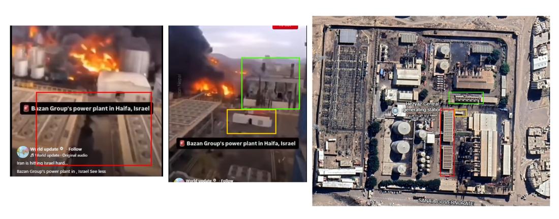 Using Google Earth, AFP Fact Check geolocated the Hezyaz power plant. Aerial imagery shows features that match the claim video, including two rectangular buildings with small round rooftop structures, a standalone white building, and a structure fitted with chimneys (archived here).