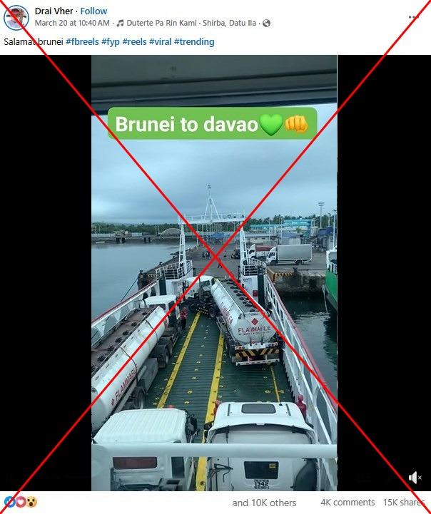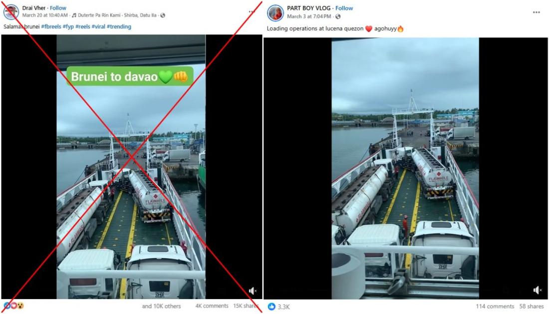 The person who posted the footage shared another video on March 23 where he said his video had been stolen and misused (archived link). He said the tanker trucks were in fact ferried to Lucena from Romblon province, "not Brunei to Davao".