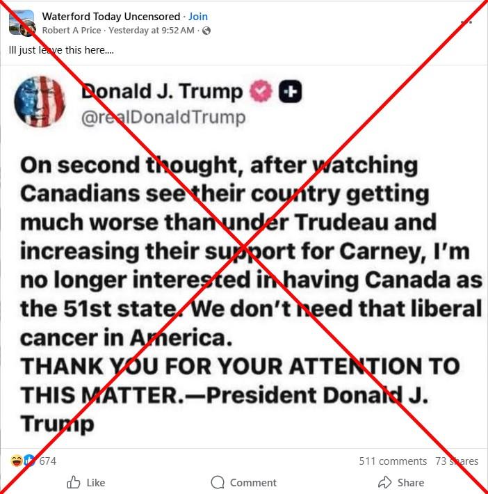 "After watching Canadians see their country getting much worse than under Trudeau and increasing their support for Carney, I'm no longer interested in having Canada as the 51st state," the text of the alleged post reads in a screenshot shared to Facebook on March 24, 2026.