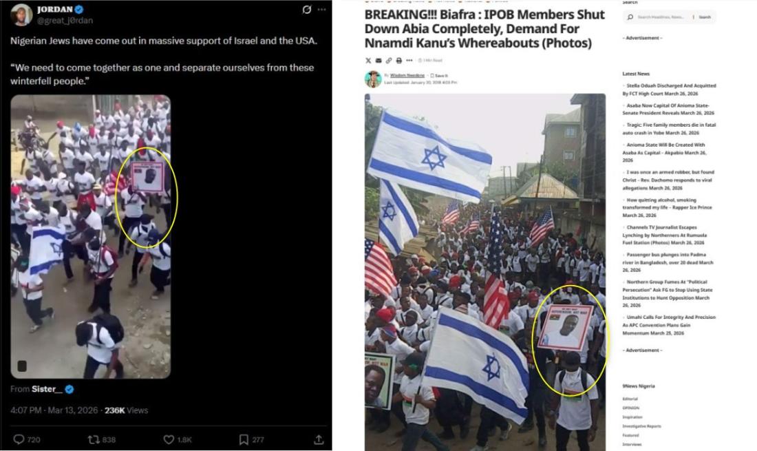 With Nigerians staging marches over the Middle East war -- some backing Iran and others the United States and Israel -- a video widely shared on social media claims that a rally was held in the African country’s southeast region to show support for the latter. However, the claim is false; the clip was filmed in 2018 at a rally organised by supporters of the secessionist Biafra campaign who were calling on Israel to support their cause.