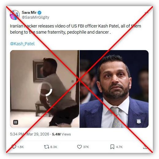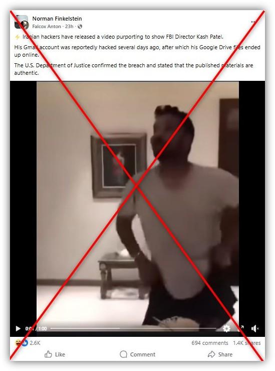 A similar post on X claims: "Iranian hacker releases video of US FBI officer Kash Patel."