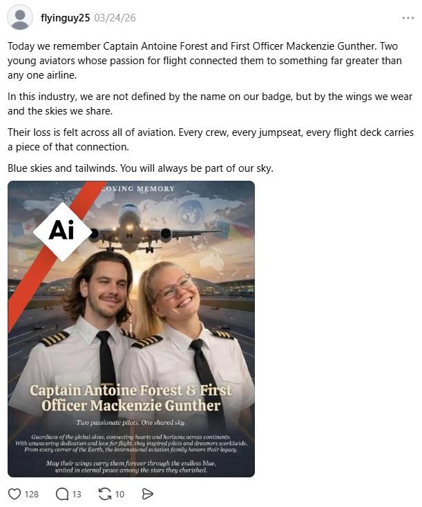 "Today we remember Captain Antoine Forest and First Officer Mackenzie Gunther," said a March 24, 2026 Threads post sharing an image of a man and woman smiling in commercial pilot uniforms.