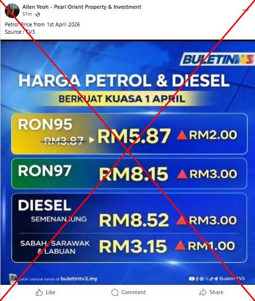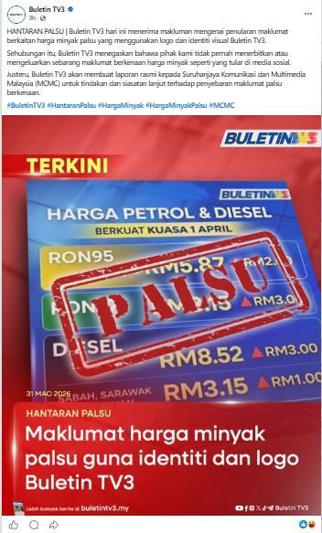"Buletin TV3 has never published or released any information about fuel prices as circulated on social media," the broadcaster said, adding that it will lodge a report with the Malaysian Communications and Multimedia Commission (MCMC) for further investigation.