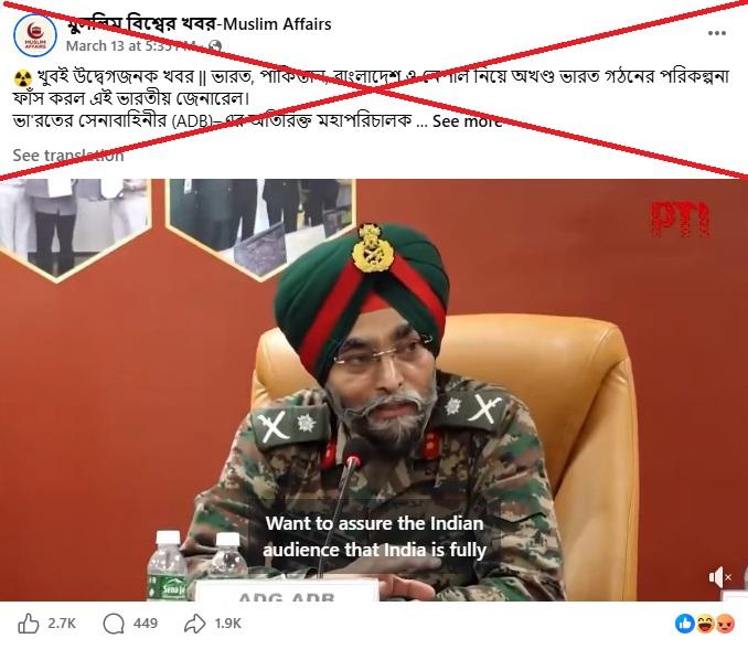 "Highly alarming news. This Indian general has leaked a plan to form an 'undivided India' comprising India, Pakistan, Bangladesh and Nepal," reads part of a Bengali-language Facebook post shared on March 13, 2026.