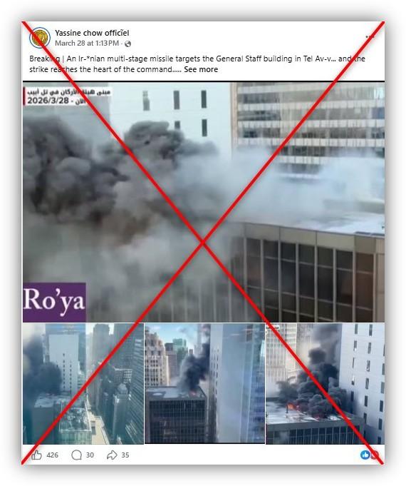 Various images are spreading on Facebook in posts claiming they show an explosion caused by an Iranian missile strike on Israel's military headquarters in Tel Aviv. But the photos are misrepresented, and in fact show stills from footage of a March 17, 2026 rooftop fire in New York City.