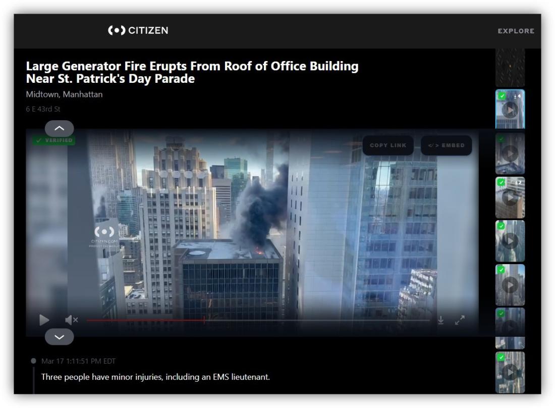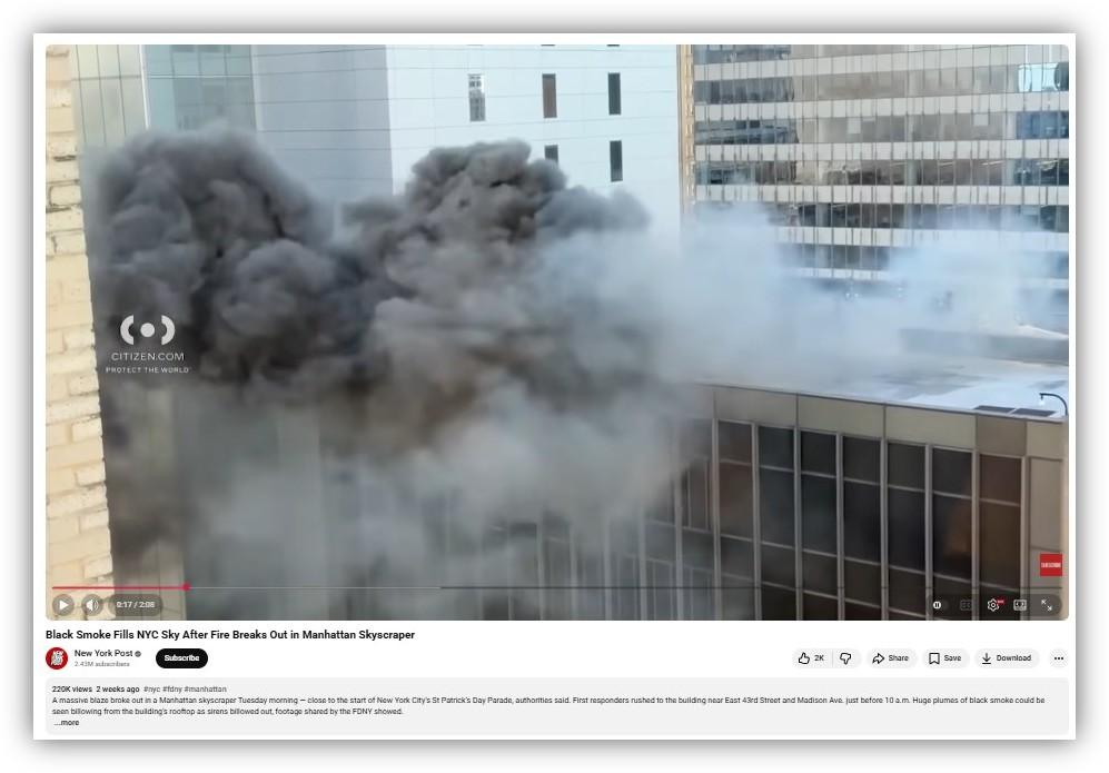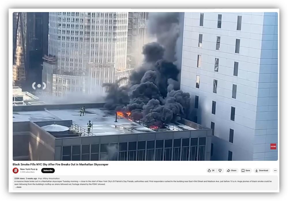 Reverse image searches surfaced footage and photos from news outlets and social media showing the same scene, described as a fire that broke out March 17 atop a Manhattan skyscraper, near an annual St. Patrick's Day parade (archived here, here, here and here).