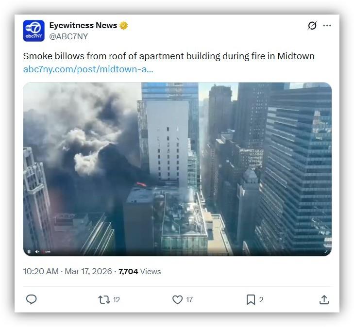 The New York City Fire Department also shared video of the billowing smoke on X, writing that the incident took place on East 43rd Street (archived here).