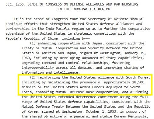 Section 1255 of the National Defense Authorization Act (NDAA), signed into law by Trump on December 18, 2025, said the United States will maintain the presence of "approximately 28,500 members" of its armed forces in South Korea (archived here and here).