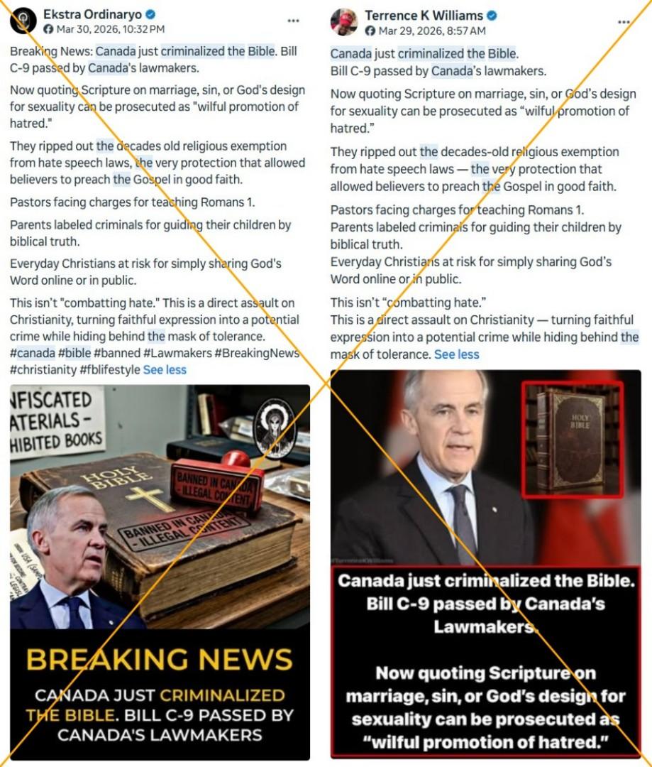 "Canada just criminalized the Bible. Bill C-9 passed by Canada's lawmakers," says a March 29, 2026 Facebook post from conservative US comedian Terrence K Williams, whom AFP has fact-checked multiple times for spreading false claims.