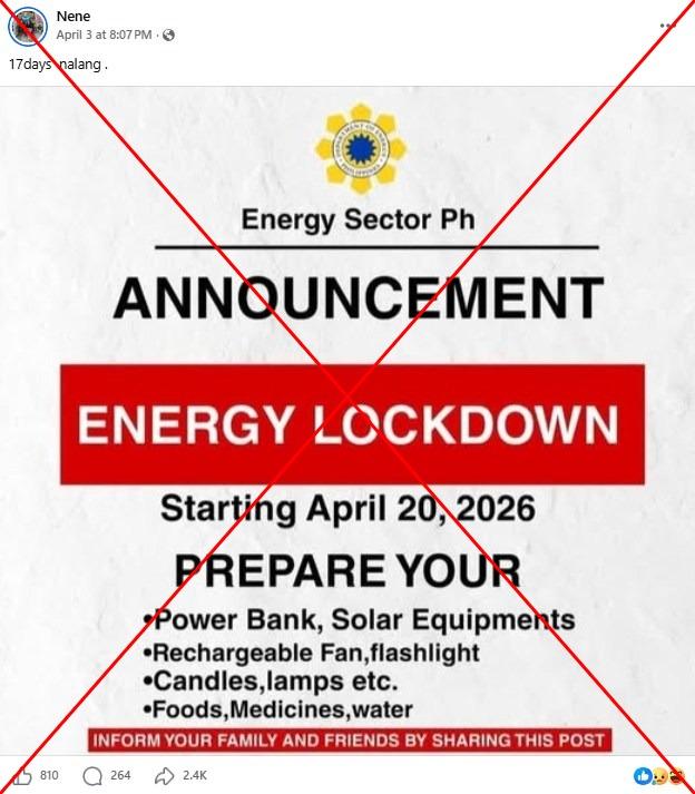 "17 days left," reads a Tagalog-language Facebook post shared on April 3, 2026 featuring a graphic bearing the logo of the Philippine energy department purportedly announcing an "energy lockdown" starting April 20.