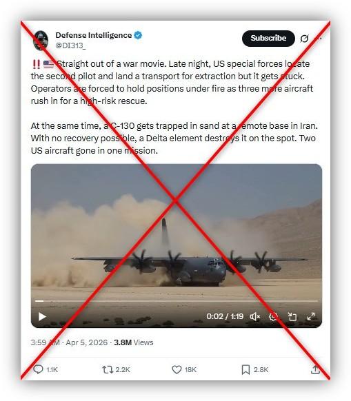 Similar claims spread across X and other platforms such as Facebook, where one widespread post alleged that a still from the footage showed the United States rushing "combat rescue planes to save downed F-15 airman from Iran."