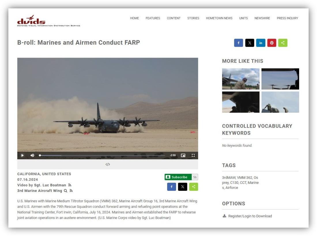The DVIDS description says: "U.S. Marines with Marine Medium Tiltrotor Squadron (VMM) 362, Marine Aircraft Group 16, 3rd Marine Aircraft Wing and U.S. Airmen with the 79th Rescue Squadron conduct forward arming and refueling point operations at the National Training Center, Fort Irwin, California, July 16, 2024. Marines and Airmen established the FARP to rehearse joint aviation operations in an austere environment."