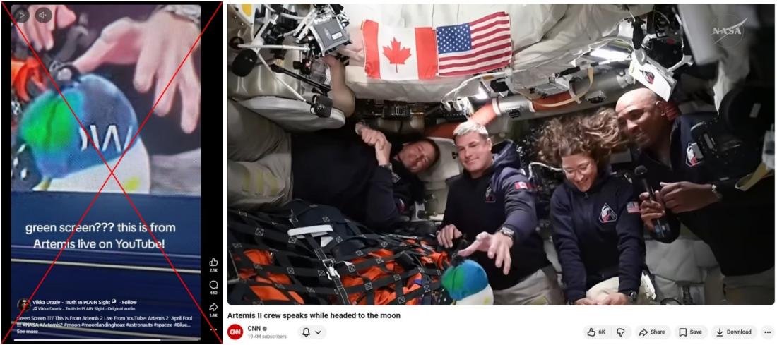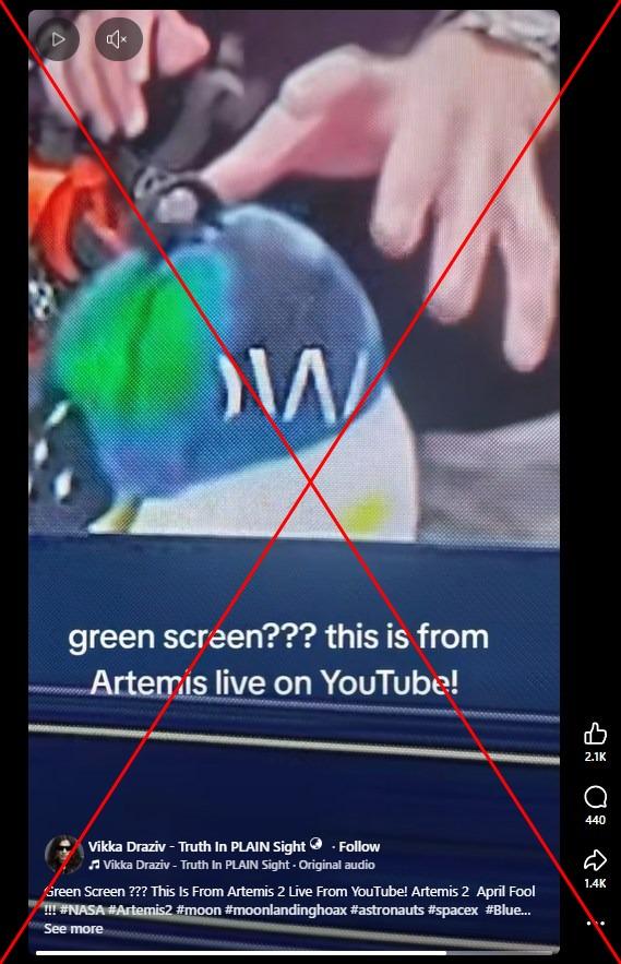 "Green screen??? this is from Artemis live on YouTube!" reads overlaid text on a Facebook video shared on April 6, 2026.