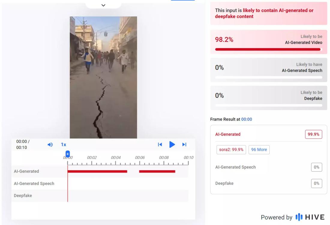 An analysis using the Hive Moderation AI detection tool found the video was "likely to contain AI-generated or deepfake content" (archived link).