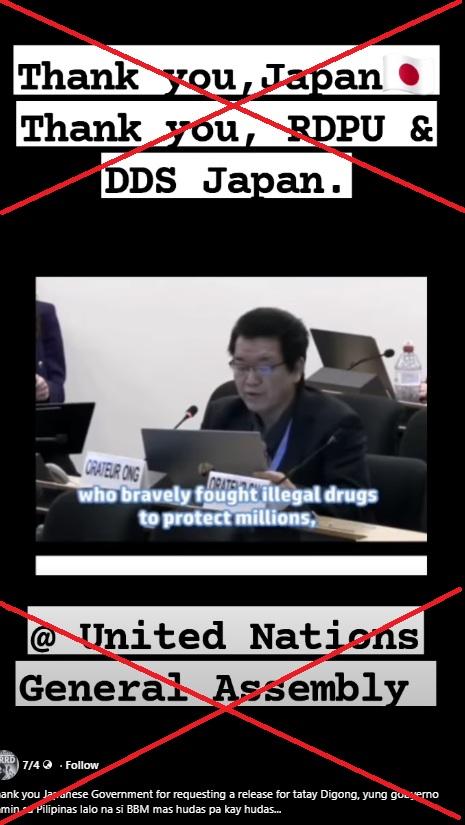 The Japanese government has not made an official request to seek the release of former Philippine president Rodrigo Duterte from International Criminal Court (ICC) custody, contrary to social media posts falsely sharing a video of a speech at the United Nations as evidence. The man in the clip was presenting the views of a non-governmental organisation registered in Japan, not those from Tokyo.