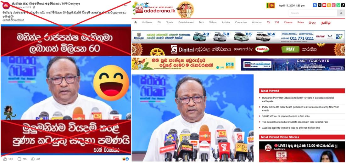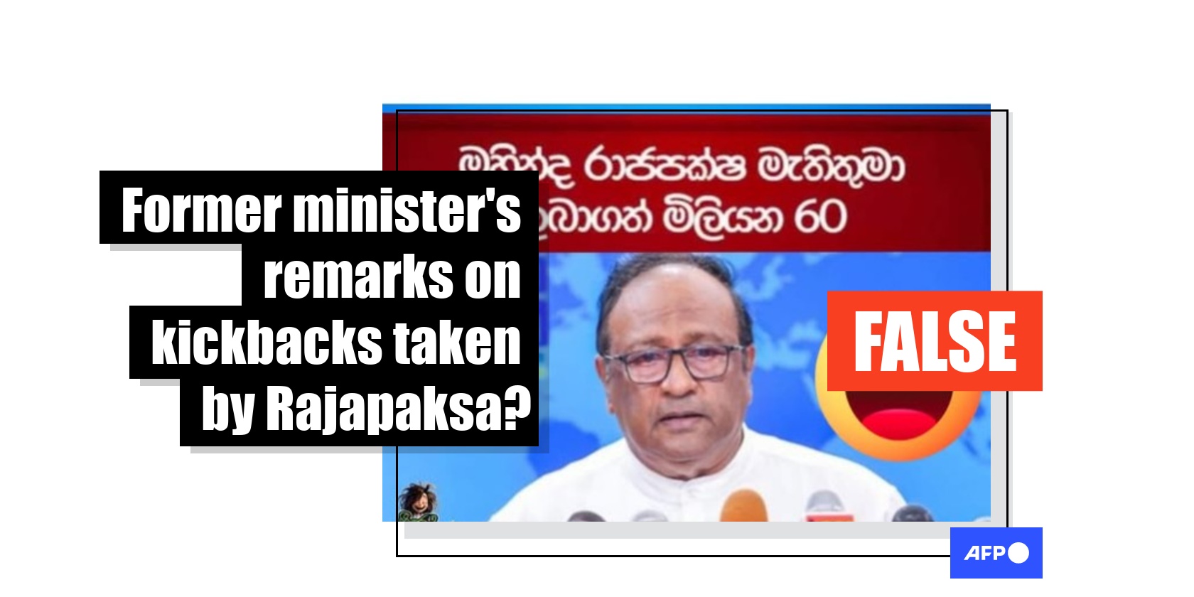 After the former head of Sri Lanka's national carrier admitted in March 2026 to bribing the country's ex-president Mahinda Rajapaksa in a deal to purchase Airbus aircraft, a fabricated report has circulated on social media that falsely claimed that one of his ex-cabinet members defended the former leader by saying he spent the bribe on charity. The ex-minister told AFP he did not make the comment, and a spokesperson for the outlet that supposedly reported on his remarks said they did not publish the news graphic shared in the posts.