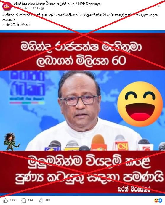 "Mr Mahinda Rajapaksa spent the entire 60 million (Sri Lankan rupees) on charitable activities -- Sarath Weerasekera," reads a Sinhala-language Facebook post shared on March 20 by a page that routinely posts content supportive of Sri Lanka's ruling coalition, the National People's Power (archived link).