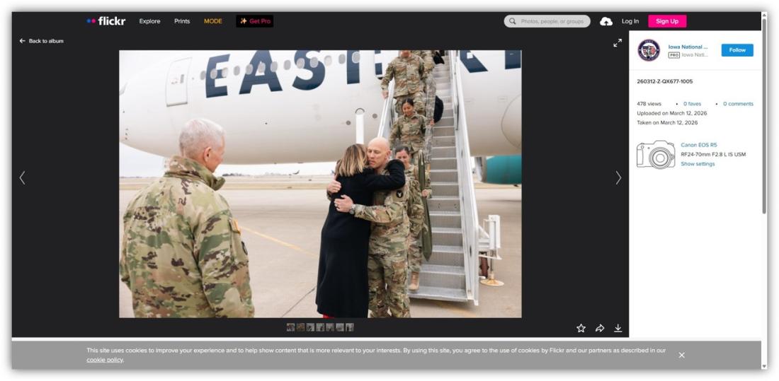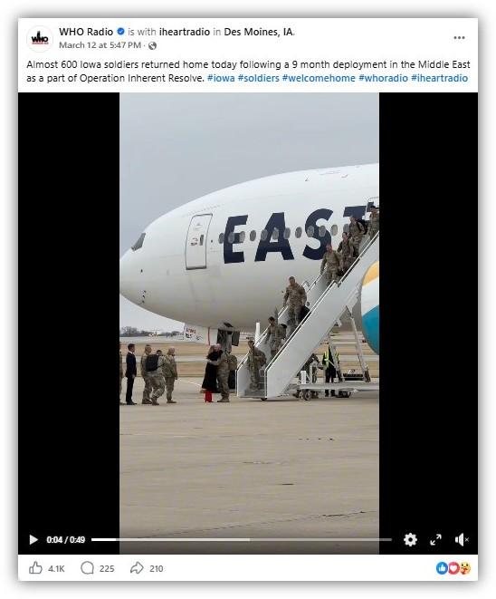 Photos posted to Flickr show the same moment captured at the start of the radio station's video, in which a soldier AFP identified as the unit's commander Colonel Eric Soults leads the group in deboarding the plane, descending the stairs and hugging Governor Kim Reynolds on the tarmac (archived here and here).