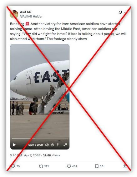 "Another victory for Iran: American soldiers have started arriving home. After leaving the Middle East, American soldiers are saying, 'Why did we fight for Israel? If Iran is talking about peace, we will also stand with them,'" says an April 7, 2026 post on X.