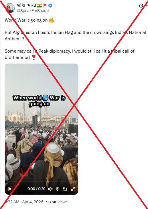 "World War is going on, but Afghanistan hoists Indian Flag and the crowd sings India's National Anthem!!" reads an X post shared on April 4. "Some may call it Peak diplomacy, I would still call it a tribal call of brotherhood."