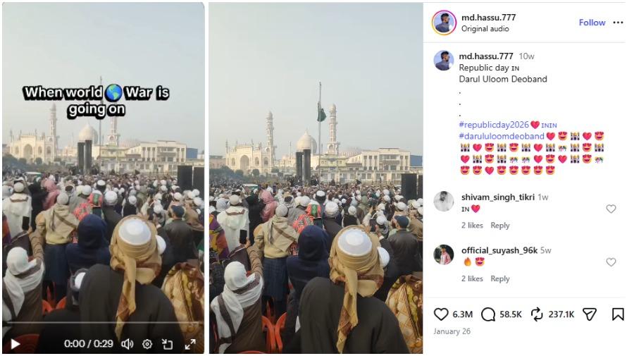 A reverse image search on Google using keyframes of the video found an identical Instagram clip published on January 26, 2026, with a caption saying it shows Indian national day celebrations at the Darul Uloom Deoband Islamic seminary in northern India (archived here and here).