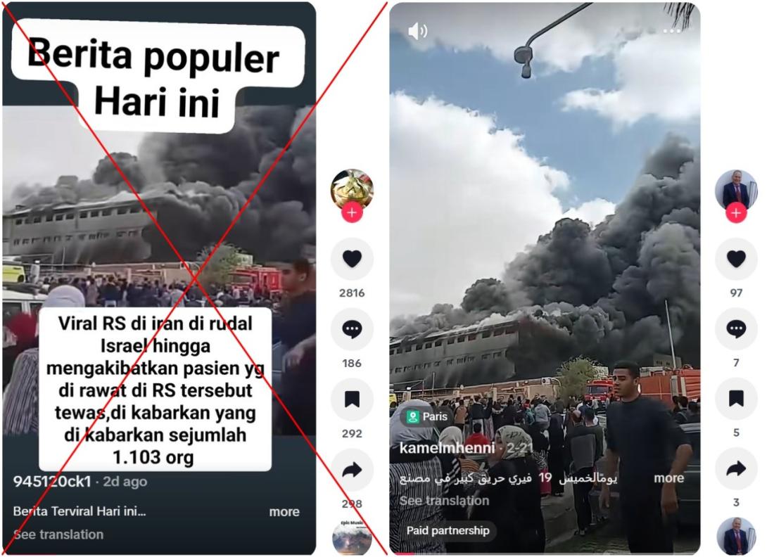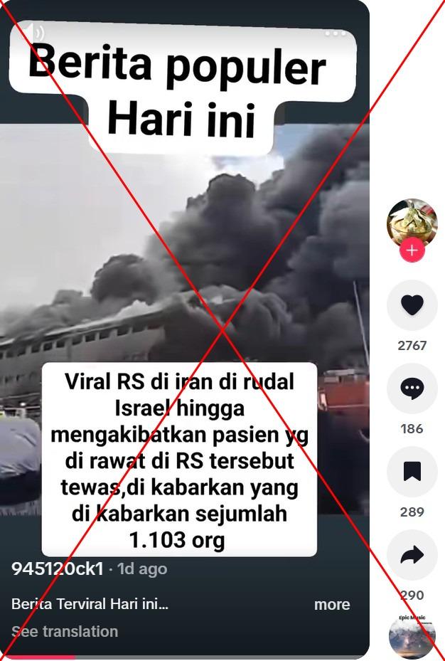 "Viral, a hospital in Iran was struck by an Israeli missile, reportedly killing 1,103 patients inside the hospital," reads Indonesian-language text over a TikTok video shared on April 8, 2026.