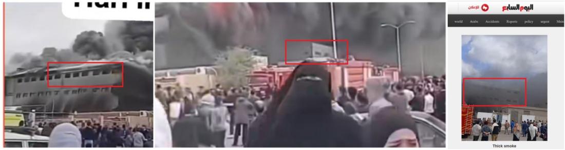 Similar visuals of the smoking factory, as well as a sign reading "Future Fashion", can also be seen in a report about the fire by Egyptian newspaper Youm7 (archived link).