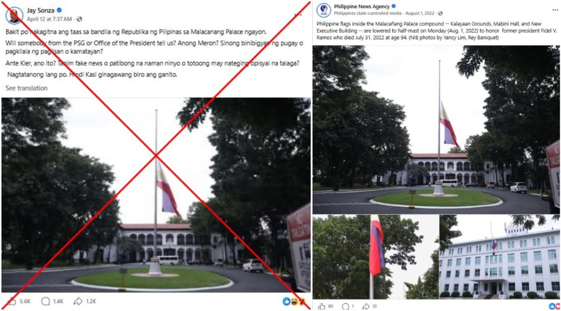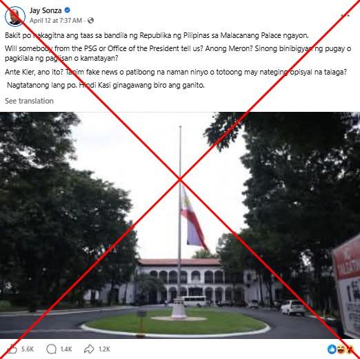 "Why is the flag of the Republic of the Philippines at Malacanang Palace currently at half-mast?" reads a Tagalog-language Facebook post shared on April 12, 2026 by Jay Sonza, a former broadcaster and supporter of influential Duterte family who has previously spread misinformation debunked by AFP.