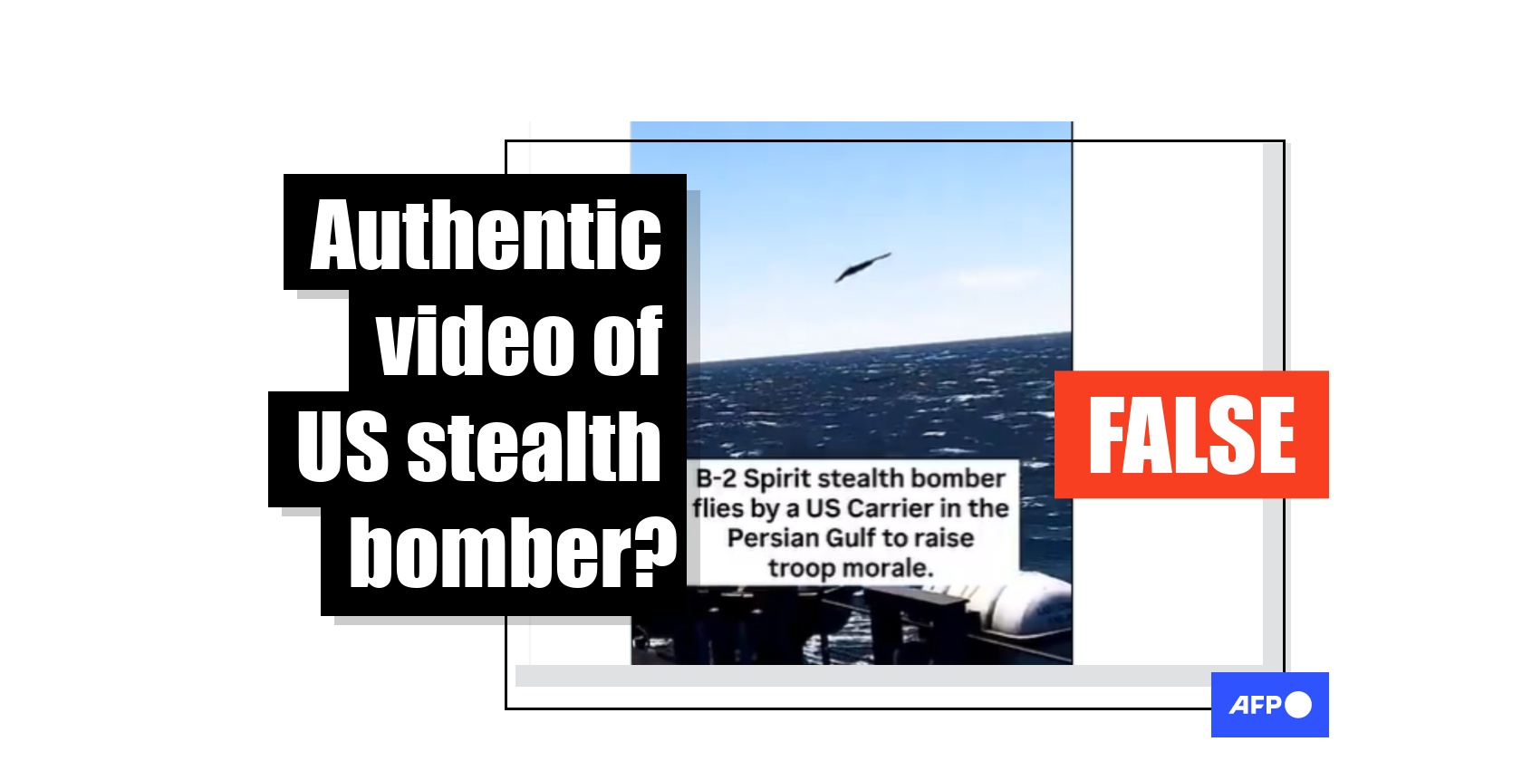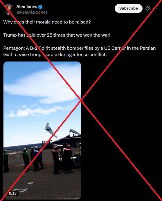 Jones's post continues, saying the video shows a B-2 Spirit stealth bomber flying "by a US Carrier in the Persian Gulf to raise troop morale during intense conflict" -- repeating a claim found in posts across social media.