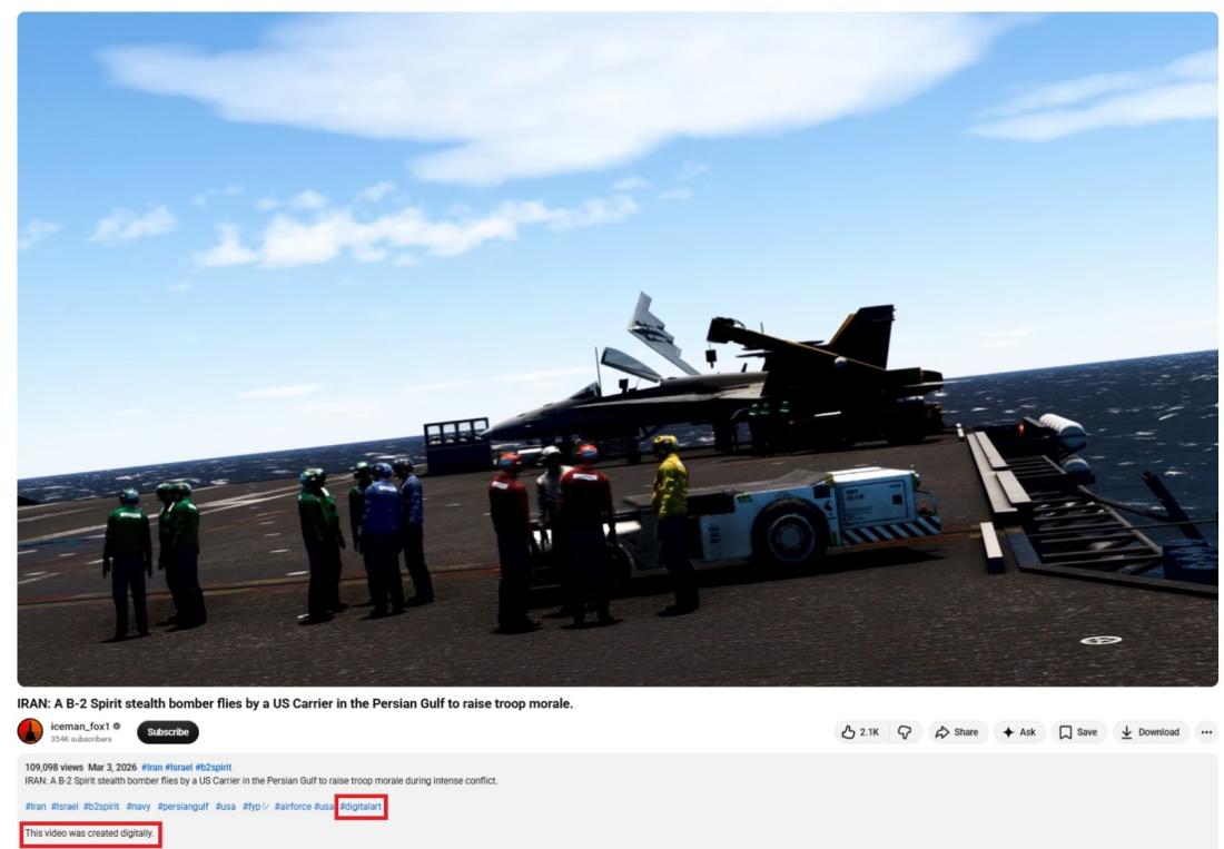 The video traces to March 3 posts on YouTube and Instagram from the profile "iceman_fox1," which says it is dedicated to "mixed reality digital aviation videos" (archived here and here). Both posts carry the disclaimer that the clip was "created digitally."