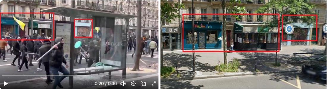 The footage also matches Google Street View imagery from near the Place de la Republique, where the protests erupted (archived link).