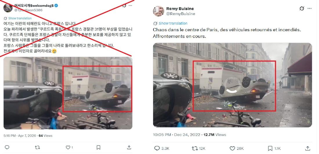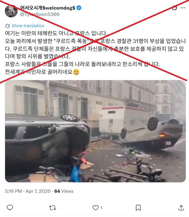 "Today, 31 French police officers were injured in the 'Kurdish riot' that has broken out in Paris," reads part of the Korean-language caption of an X video shared on April 7, 2026.