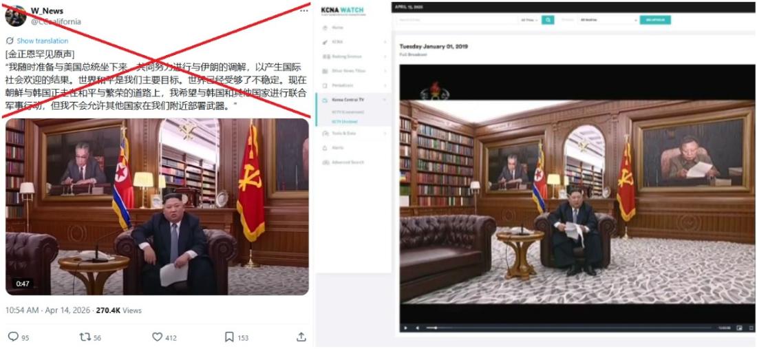 As Iran and the United States mull further talks in Islamabad after negotiations initially collapsed in April 2026, Chinese social media posts circulated a mistranslated footage of North Korean leader Kim Jong Un falsely claiming it shows him offering to mediate the deal. It is in fact his New Year address in 2019, and there was no mention of Iran anywhere in his speech.