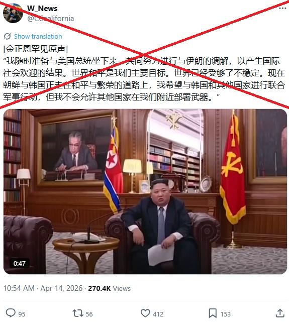 "I am ready at any time to sit down with the president of the United States and work together on mediation with Iran in order to produce results that will be welcomed by the international community. World peace is our main goal. The world has had enough of instability," reads a simplified Chinese X post shared on April 14, 2026, referring to the quote as a "rare original recording of Kim Jong Un".