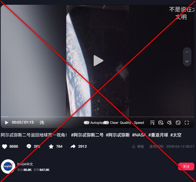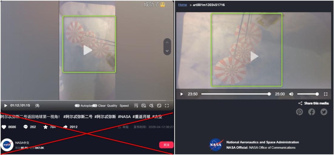The video was shared in similar Chinese-language posts on Weibo, Rednote, X, and YouTube after the Artemis II crew -- NASA’s Reid Wiseman, Victor Glover, and Christina Koch, along with the Canadian Space Agency’s Jeremy Hansen -- splashed down without a hitch off the California coast on April 10 after a high-stakes re-entry (archived link).