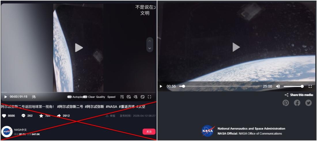 But the video is from an earlier, uncrewed lunar mission in 2022. NASA also does not have any official Chinese-language social media accounts (archived link).