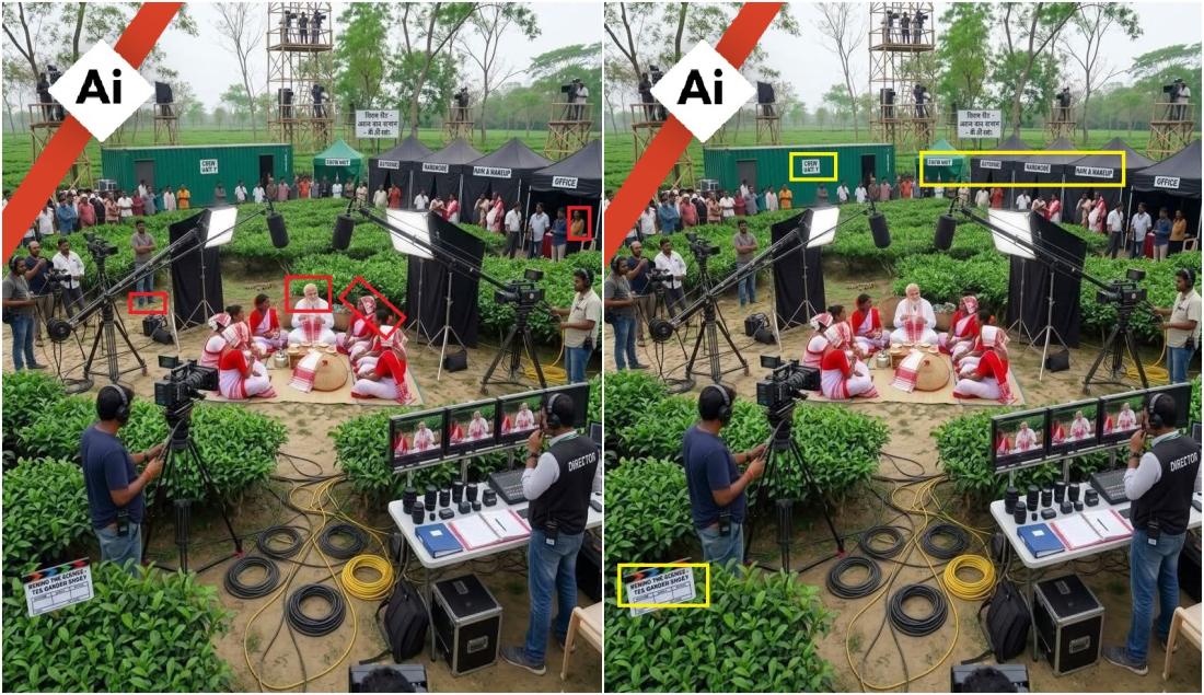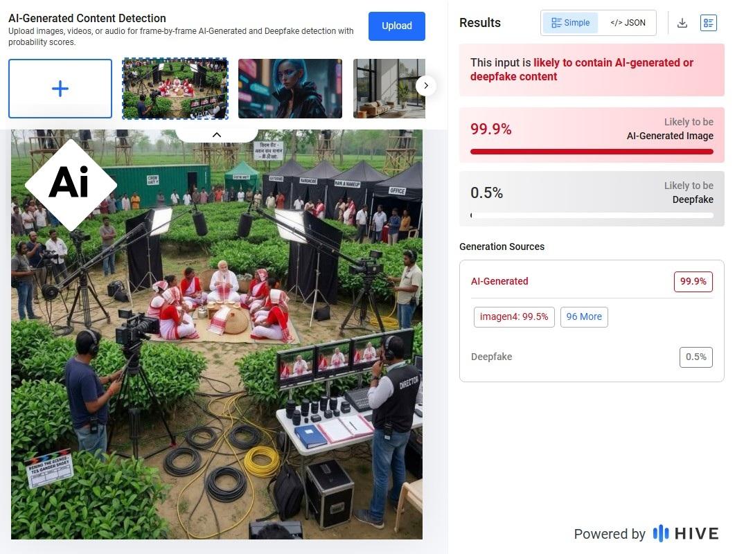 Indian Prime Minister Narendra Modi paid a visit to a tea garden in Assam on April 1 ahead of the northeastern state's elections, but an image purportedly showing his interaction with local workers being documented by a large film crew is AI-generated. The image contains visual errors and was flagged as likely containing AI-generated content by a detection tool.