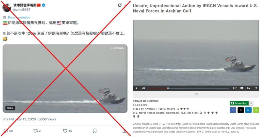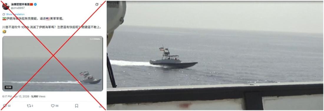After US President Donald Trump warned in April 2026 that US forces would destroy any Iranian "fast attack ships" that approach the American naval blockade of Iranian ports, posts recirculated an old video falsely claiming it shows an Iranian navy speedboat intercepting an American warship. The footage was filmed in 2022 when an Iranian navy vessel approached a US patrol coastal ship at high speed.