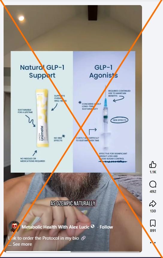 "This does the exact same thing as Ozempic, naturally, with no side effects and no interactions," says the speaker in a March 27, 2026 Facebook reel.