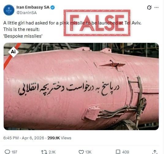 “A little girl had asked for a pink missile to be launched at Tel Aviv. This is the result: ‘Bespoke missiles’,” reads the caption of a post on X, published on the official account of the Iranian embassy in South Africa on April 6, 2026.