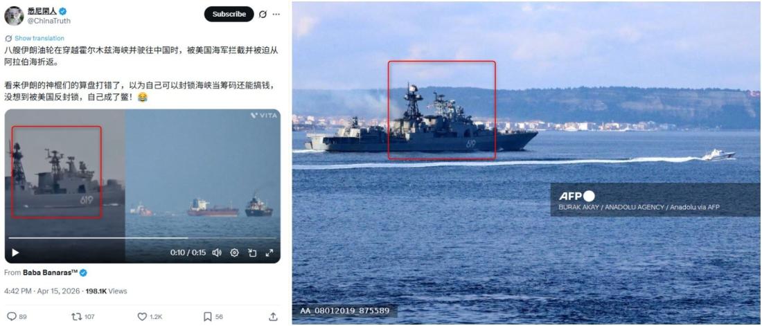 The United States has ordered vessels in the Strait of Hormuz to return to Iran as it maintains a naval blockade, but video purportedly showing these ships shared on social media in fact depicts a Russian destroyer and a weeks-old photo from the waterway. The footage of the Russian warship matches images previously distributed by AFP, while the photo included in the falsely shared video was earlier published by The Associated Press news agency on March 11.