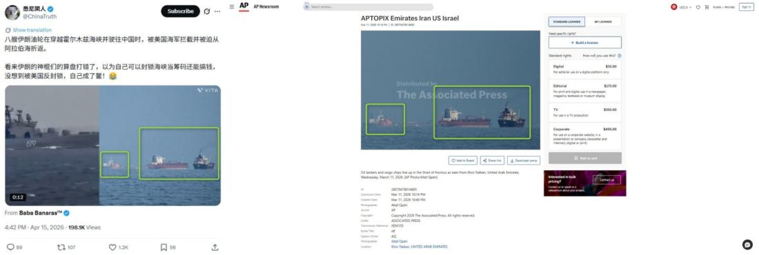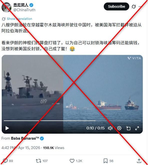 "Eight Iranian oil tankers, while crossing the Strait of Hormuz and heading to China, were intercepted by the US Navy and forced to turn back from the Arabian Sea," reads part of the simplified Chinese caption of an X video shared on April 15, 2026.