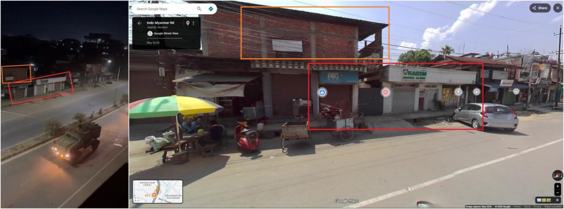 Google Street View imagery of the location matches a series of shops seen in the video, confirming it was filmed in Manipur (archived link).