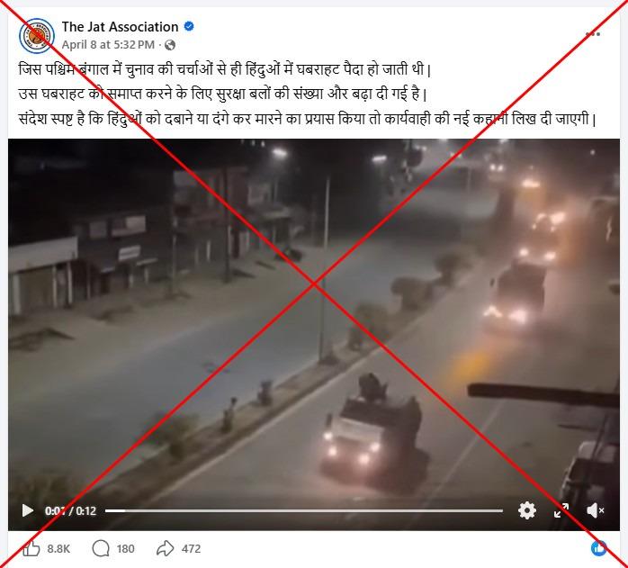 "In West Bengal, even the mere mention of elections used to create panic among Hindus. To tackle it, security forces have been increased. The message is clear: if any attempt is made to suppress or kill Hindus through riots, action will be taken," says the Hindi-language Facebook post from April 8, 2026.