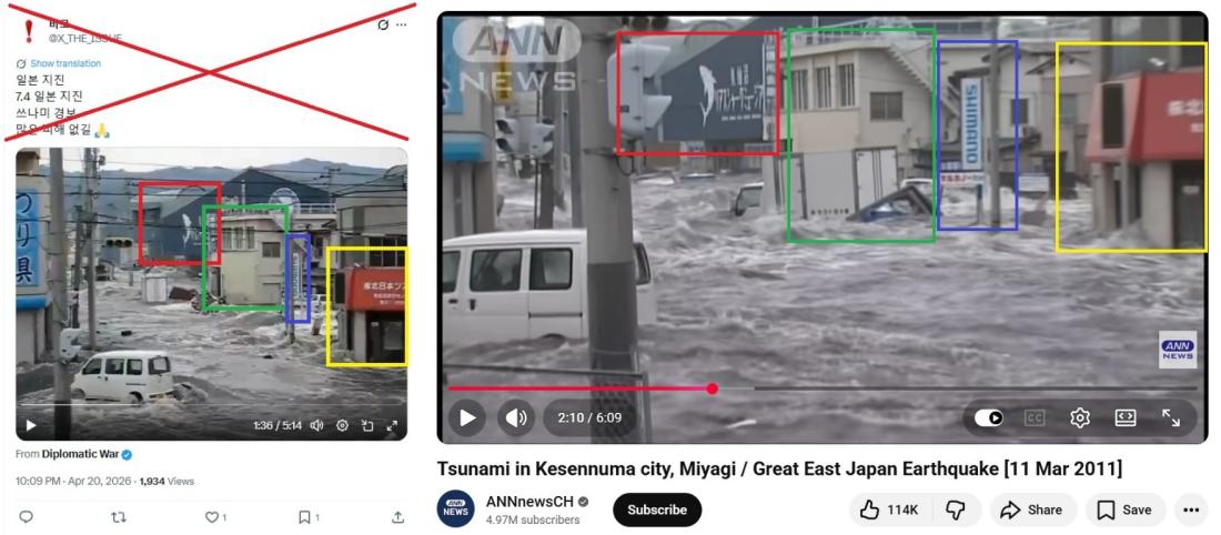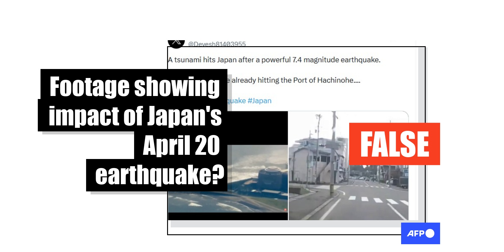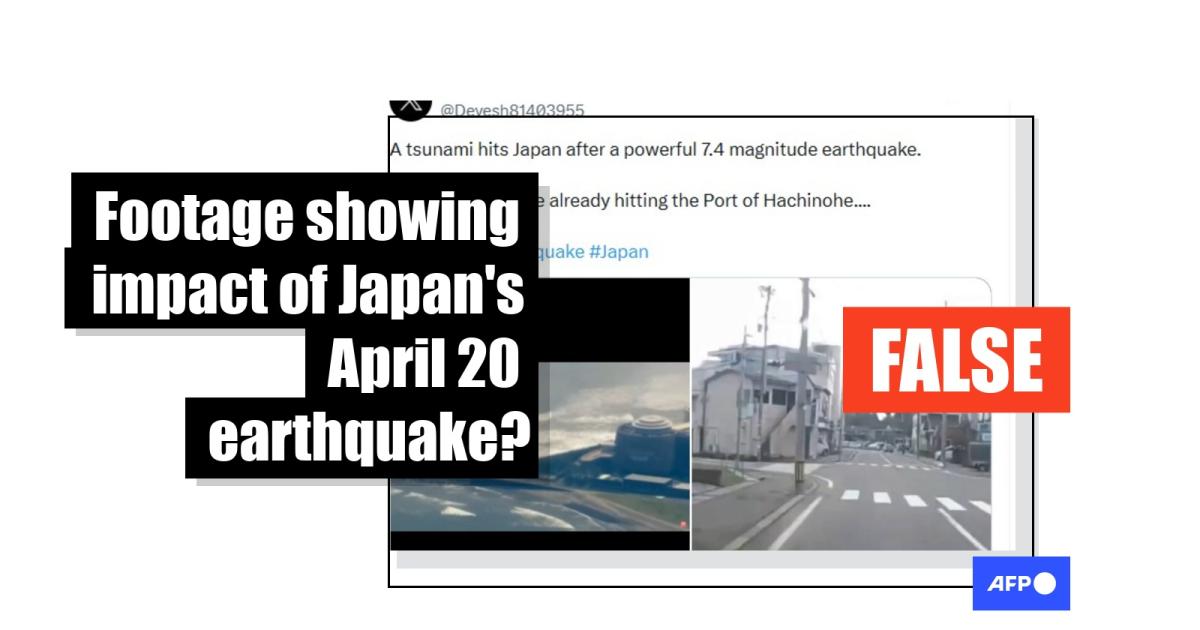 After a magnitude 7.7 earthquake struck off the northeastern coast of Japan on April 20, a wave of videos purportedly showing the impact of the tremor was falsely shared on social media. The clips in fact show earthquakes that predate the April temblor. They depict the moment a tsunami hit eastern Japan in 2025, the aftermath of a quake that rattled a prefecture in western Japan on New Year's Day in 2024, and the devastating earthquake and tsunami that struck in March 2011.