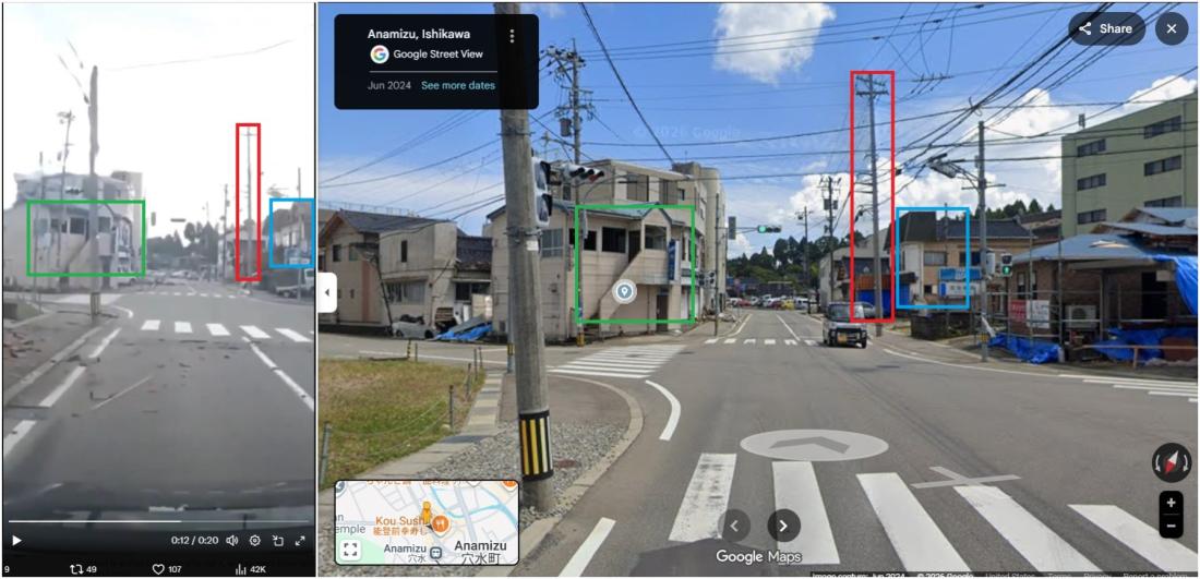 The footage matches Google Street View imagery of an intersection in Anamizu, a town in Ishikawa prefecture on Japan's western coast (archived link).
