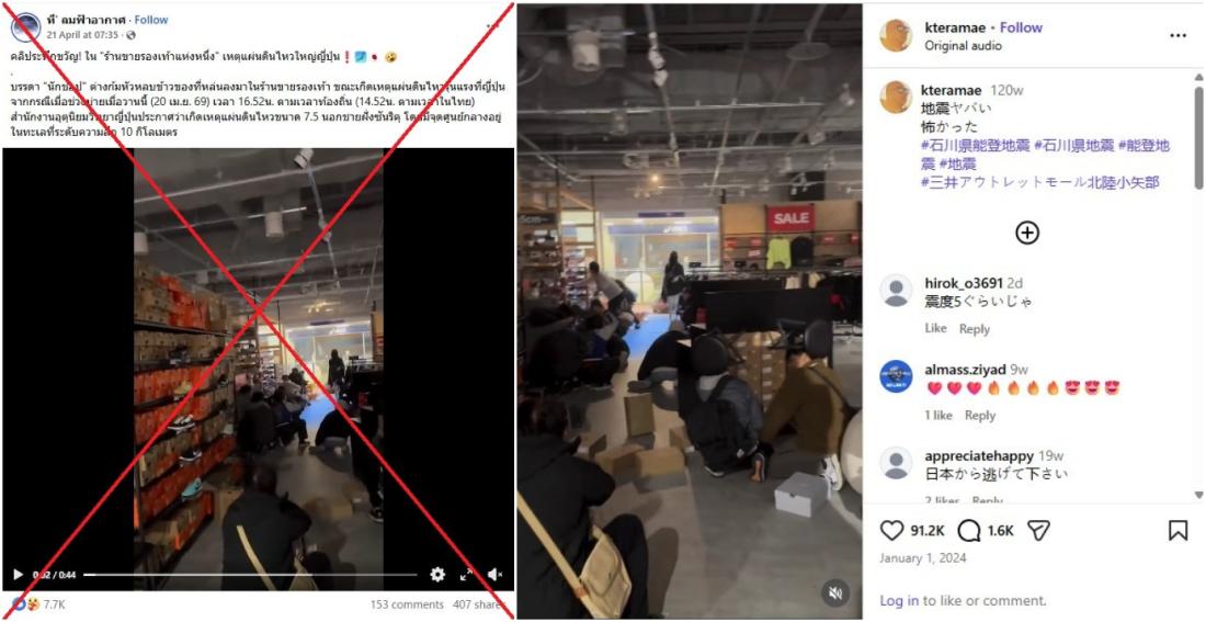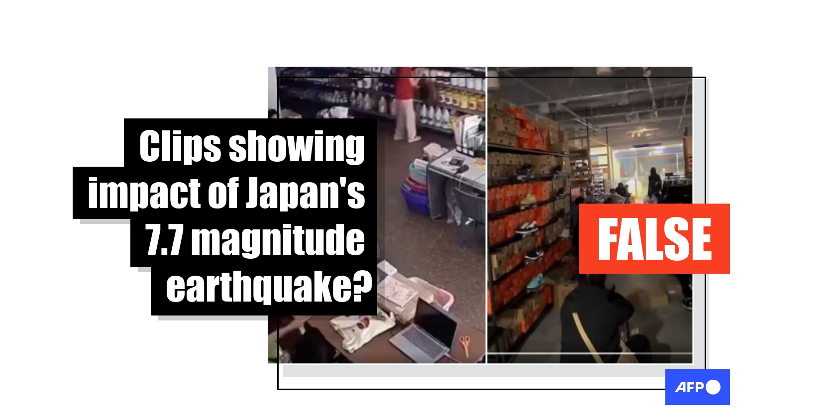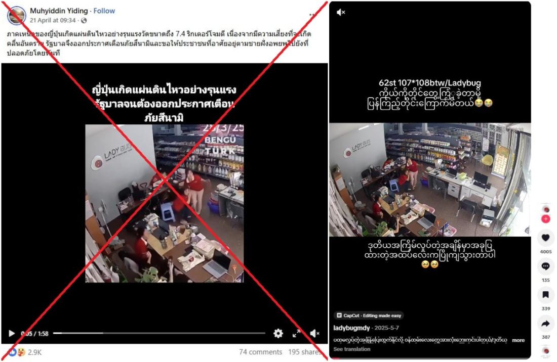 A magnitude 7.7 earthquake rattled northern Japan on April 20, 2026, but videos shared on social media claiming to show the impact of the tremor in fact depict earlier quakes. One clip circulating online shows a shop in central Myanmar that later collapsed during the deadly March 2025 quake, while the other clip shows shoppers bracing themselves during the January 1, 2024 tremor that rocked western Japan.