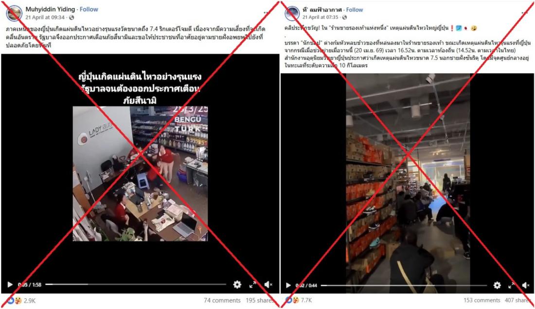 The same videos were also shared in similar posts in several languages after Japan -- one of the world's most seismically active countries -- was struck by a magnitude 7.7 earthquake on April 20 (archived link).